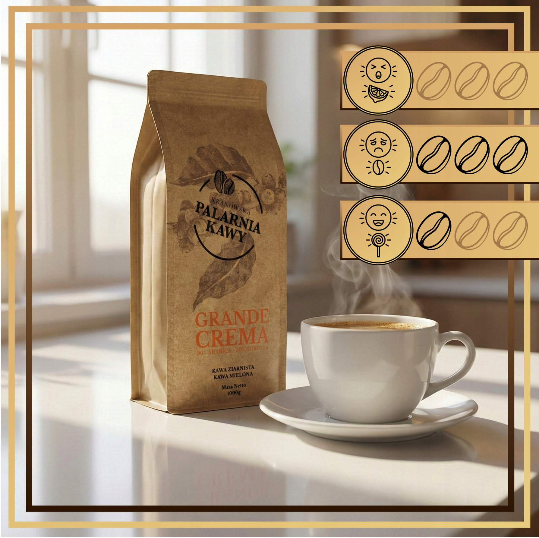 Grande Espresso charakteryzuje się średnią kwaskowatością (3/5), lekką nutką goryczki (2/5) oraz orzechowo-czekoladowym smakiem.